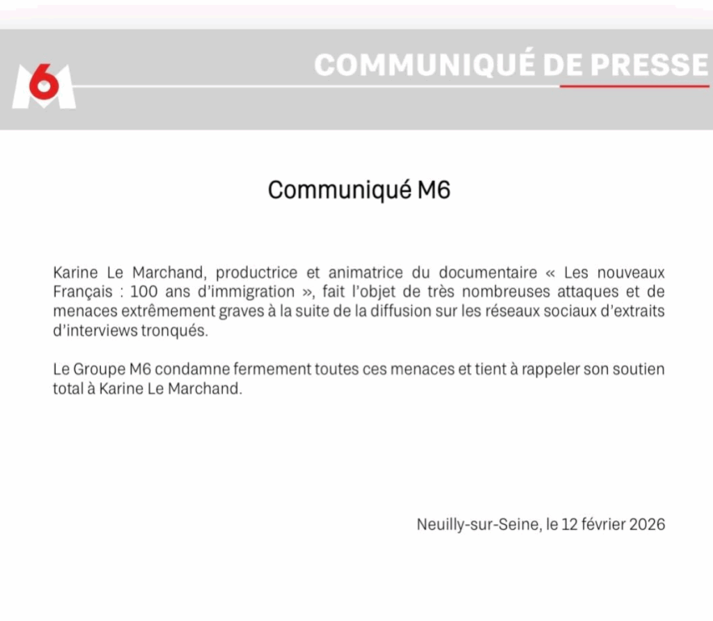 Quelques jours après la polémique, le groupe M6 a tenu à réagir officiellement. Selon la chaîne, Karine Le Marchand, animatrice et productrice du documentaire Les nouveaux Français : 100 ans d’immigration, subirait des attaques répétées et des menaces inquiétantes sur les réseaux sociaux. Le groupe, dirigé par David Larramendy, affirme apporter son soutien sans réserve à l’animatrice et condamner fermement ces comportements.