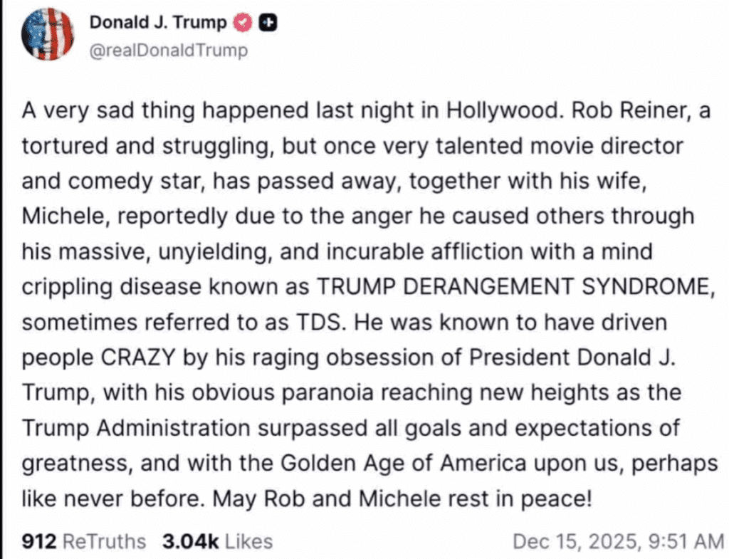 Sur sa plateforme Truth Social, Donald Trump a publié un message qui a stupéfié jusqu’à certains de ses soutiens. Il y a qualifié Rob Reiner de personne « dérangée » par ce qu’il appelle le “Trump Derangement Syndrome”. Il s’agit d’une expression péjorative utilisée par certains conservateurs pour moquer les critiques virulentes contre Trump. Le président a même suggéré, sans preuve, que le décès de Reiner était lié à cette obsession politique.