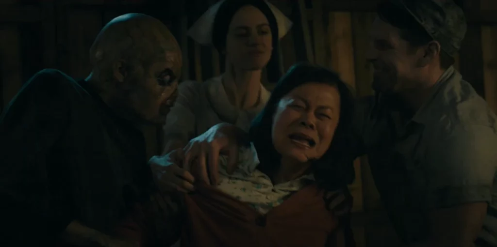 Les créatures au sourire figé ont également évolué. Elles ne se contentent plus de chasser ; elles manipulent. Le moment le plus insoutenable de la saison reste l’exécution de Tian-Chen Liu. Capturée par les monstres, elle est torturée à mort sous les yeux d’un Boyd Stevens impuissant, enchaîné à quelques mètres d’elle. Cet acte n’avait aucun but nutritif pour les monstres : c’était une attaque psychologique visant à briser le moral du shérif. La mort de la matriarche du groupe laisse un vide immense et installe une atmosphère de défaite permanente.