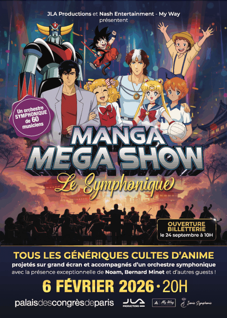Si vous suivez VL, vous connaissez notre amour pour les génériques de dessins animés auxquels on consacre de nombreuses émissions. Le 6 février 2026, le Palais des Congrès fera retentir les plus grandes chansons avec un orchestre symphonique de 60 musiciens dirigé par Ralph Szigeti. Pour l’occasion, les plus grandes chansons seront interprétées comme : Goldorak, Candy, Princesse Sarah, Les Chevaliers du Zodiaque, Jayce et Les Conquérants de la Lumière, Dragon Ball et Dragon Ball Z, Olive et Tom, Embrasse-moi Lucile, Les Mystérieuses Cités d’Or. Mais ce n’est pas tout car les plus grands interprètes seront aussi sur scène pour chanter leur titre comme Noam, Bernard Minet, Dominique Poulain, Jean-Paul Cesari… Enfin, des créateurs japonais viendront aussi évoquer les origines des personnages cultes, mais on en sait pas plus pour l’instant.