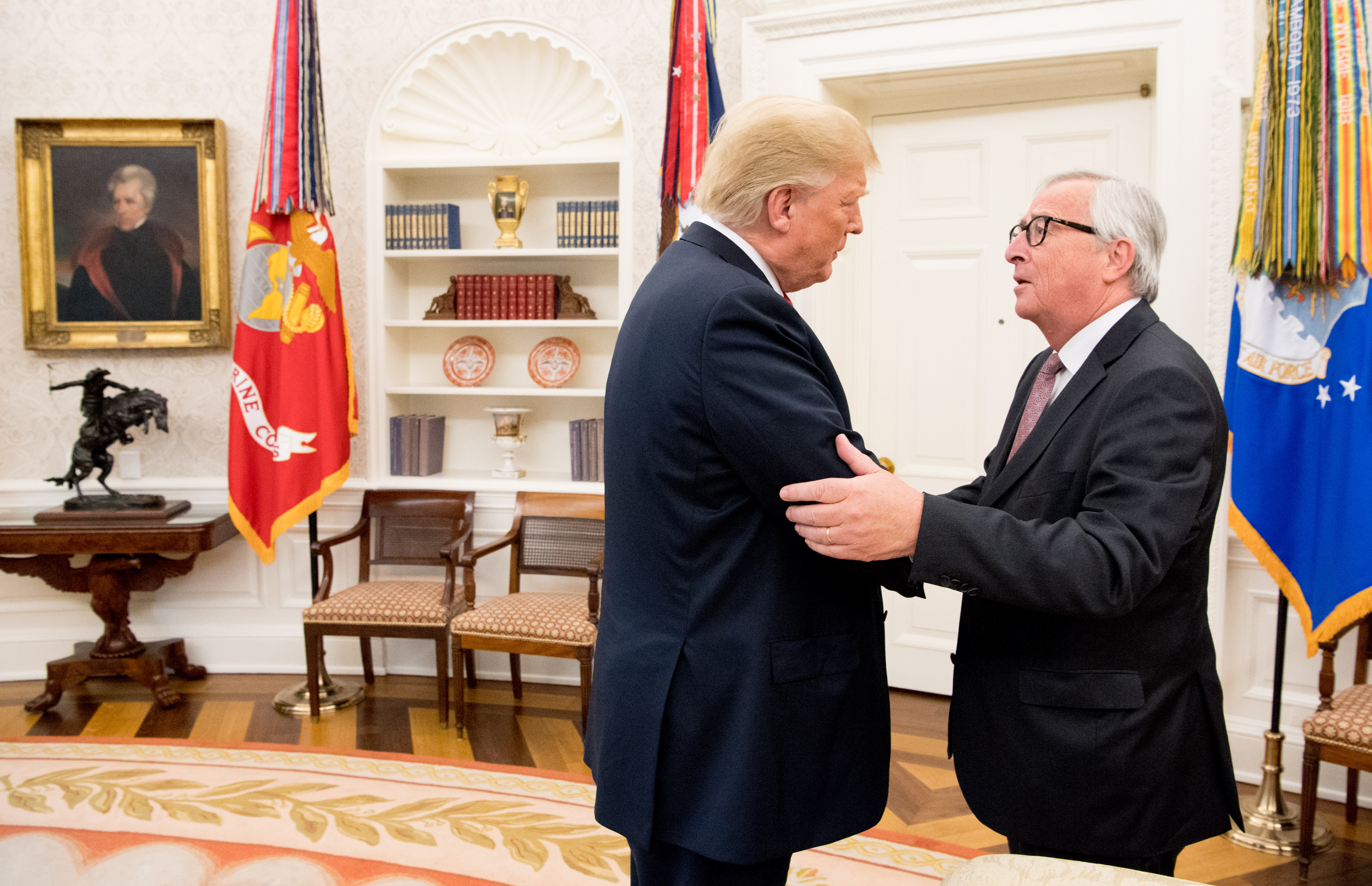 Cette déclaration commune fait office d’apaisement après la guerre des taxes sur l’acier et l’aluminium. Néanmoins, ces droits de douane ne sont pas levés même si Donald Trump a déclaré que « Nous allons résoudre la question des droits de douane sur l’acier et l’aluminium et des mesures de rétorsions ».