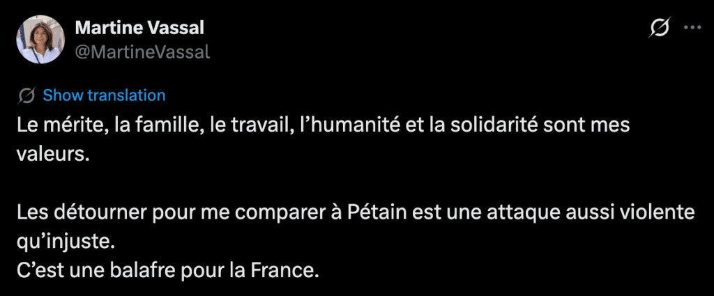 Son porte-parole, Romain Simmarano, a dénoncé les interprétations qui assimilent la candidate au pétainisme : « Martine Vassal est aux antipodes des valeurs pétainistes », a-t-il déclaré, rappelant que le régime de Vichy reste « une abomination qui défigure la France pour toujours ».