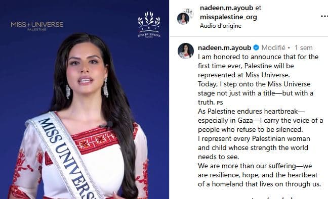 Pour la toute première fois, le concours Miss Univers accueille cette année une candidate représentant la Palestine : Nadeen Ayoub.