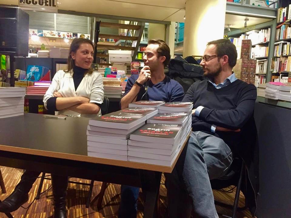 Anne-Clémentine Larroque, Charles Nadaud et Jean-Baptiste Guégan présentent leur livre lors d’une conférence à la Librairie de Paris (XVIIè). Photo : Julie Fortun